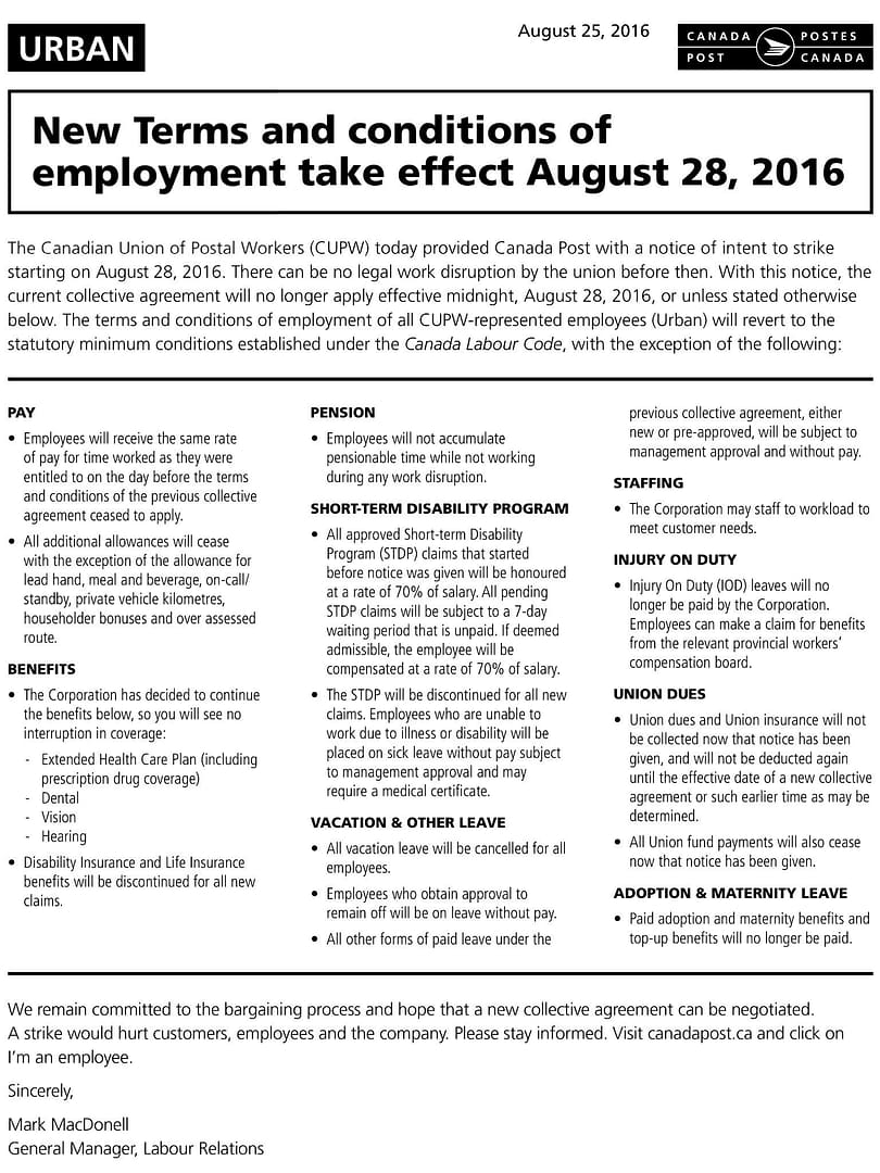 Canada Post cancels postal workers’ vacations, maternity & adoption benefits.